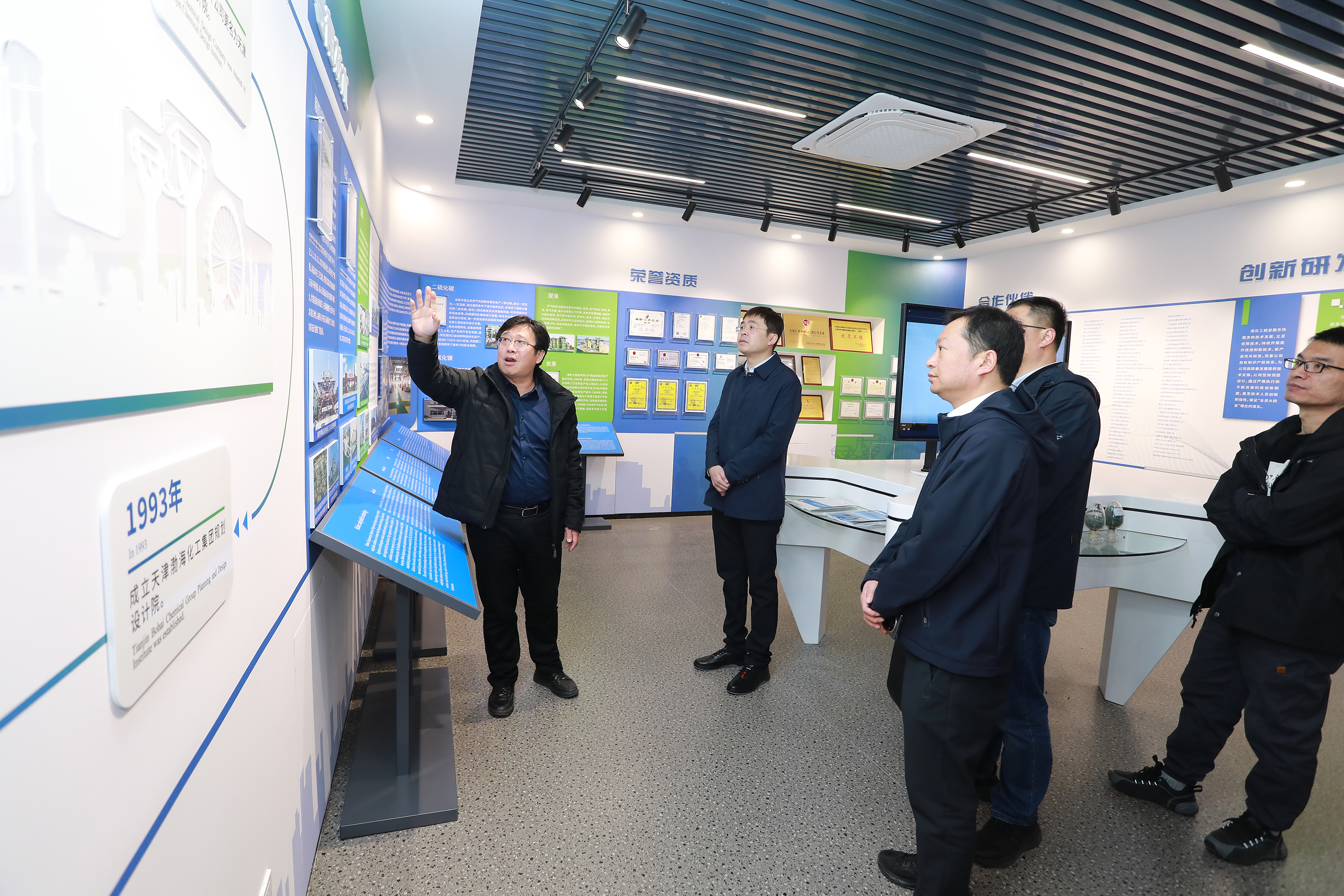 考察團一行首先參觀了渤化工程侯德榜雕像和多媒體展廳,隨后在公司會議室進行溝通交流。蔣澤宇介紹了江河園區(qū)的相關(guān)情況,并與渤化工程就該化工園區(qū)中七臺河科技小鎮(zhèn)項目產(chǎn)業(yè)發(fā)展方向、建筑風格,公用配套設(shè)施等具體問題進行了交流討論,雙方針對園區(qū)的特點及后續(xù)招商、發(fā)展規(guī)劃等方面進行了深入的探討分析。